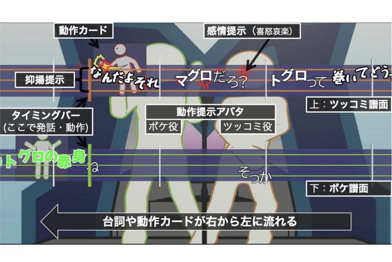 台詞は、ボケ役とツッコミ役のそれぞれのタイムラインに、上下5段階の音程を付けて表示される。感情は喜怒哀楽の4種類が文字フォントや視覚エフェクトで示され、動作は、台詞に関連する主要な動作が「動作カード」で示される。画面の背景には、2人の動作がアバターの動画で表示されるといった具合だ。