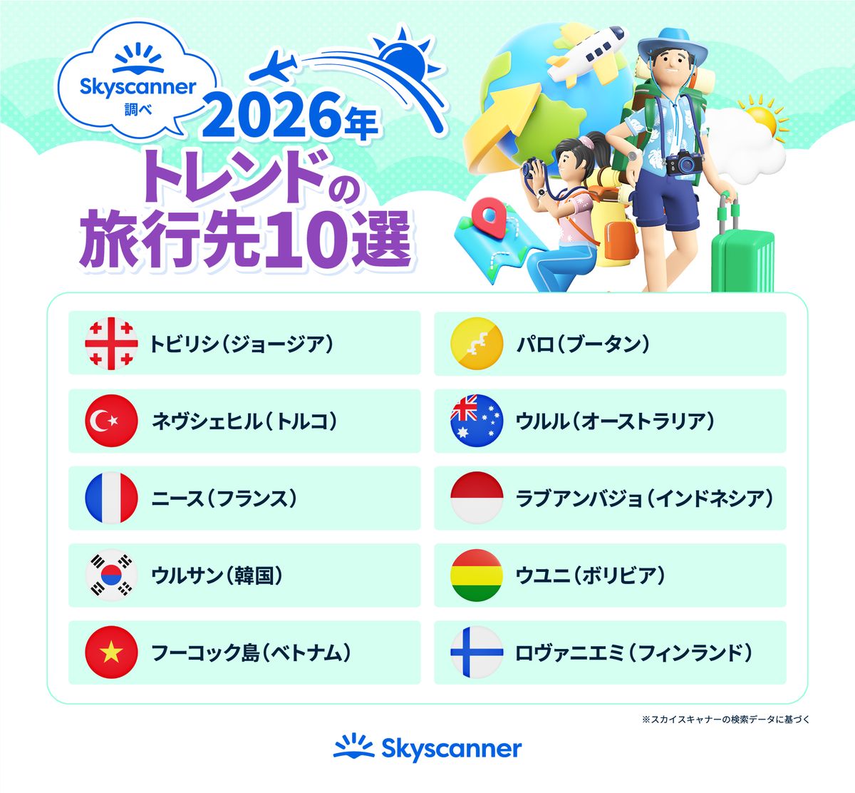 日本人旅行者の価値観に大きな変化が起きているようだ。パリやロンドンといった定番の観光地ではなく、ジョージアのトビリシやブータンのパロなど、これまで日本人にはあまり馴染みのなかった目的地への検索が急増していることが、旅行アプリのスカイスキャナーが発表した「2026年トレンドが予測される旅行先10選」で明らかになった。