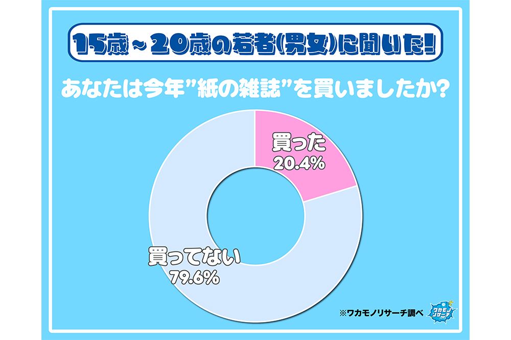 10代と現役高校生を対象としたマーケティング情報サイト「ワカモノリサーチ」は、全国の15〜20歳931人を対象に「紙の雑誌」に関するアンケート調査を行ったところ、今年、紙の雑誌を買ったという人は約2割という衝撃的な結果が出た。