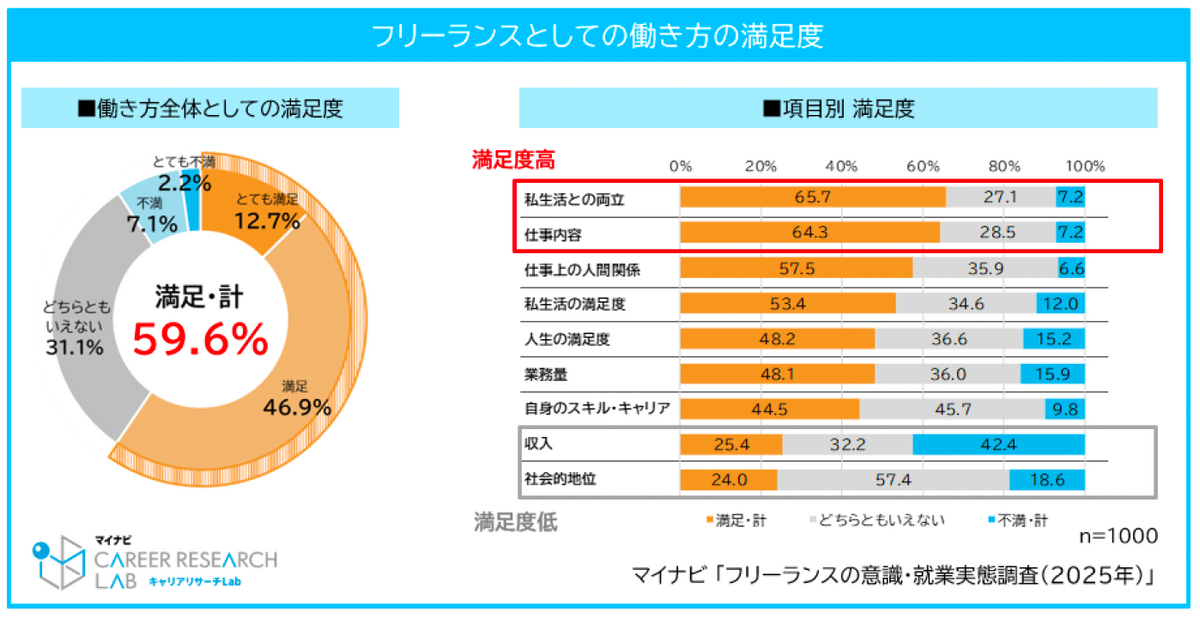 フリーランスという働き方への満足度は59.6%と、半数以上が肯定的に捉えている。項目別では「私生活との両立」(65.7%)、「仕事内容」(64.3%)で特に満足度が高く、働き方の自由度や業務選択の柔軟性が評価されている。