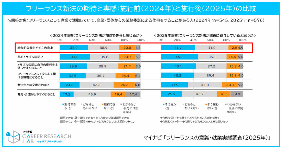 調査では、すべての項目で施行前の期待値を上回る結果となった。特に「契約トラブルの防止」「トラブルの際の権利主張のしやすさ」「安心して働ける環境になること」の3項目では、4割以上が「改善に寄与している」と回答しており、制度の実効性が一定程度認識されている。