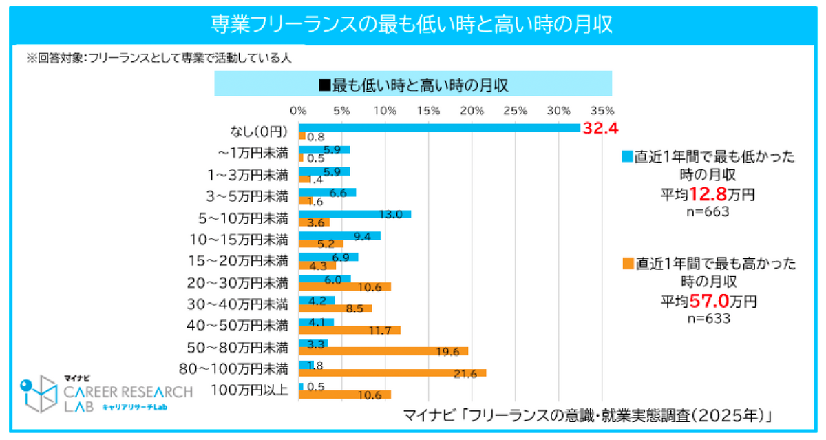 専業フリーランスの年間収入の平均は528.1万円で、日本全体の平均年収478万円を上回っている。しかし月収の変動幅は大きく、直近1年間で最も多い時の月収平均が57.0万円であるのに対し、少ない時の平均は12.8万円まで下がる。さらに、収入が0円だった月がある人も32.4%にのぼる。