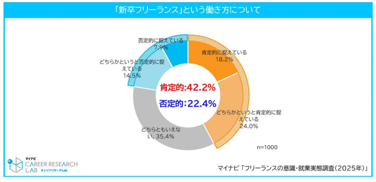 大学卒業後すぐにフリーランスとして働き始める「新卒フリーランス」という働き方については、42.2%が肯定的に捉えており、否定的な22.4%を大きく上回った。