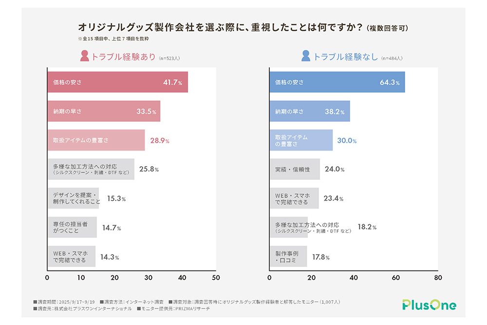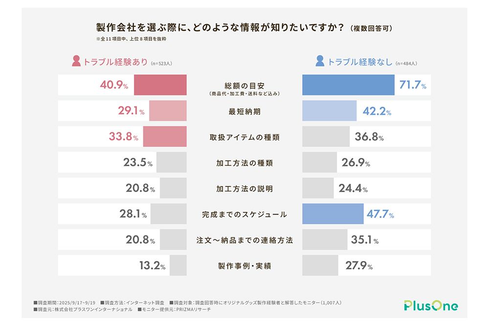 総額と納期までは同じだが、トラブル経験を持たない人たちの3位はアイテムの豊富さでなく、完成までのスケジュールだった。また、納品までの連絡方法、製作事例と実績が、未経験者よりも割合が高い。