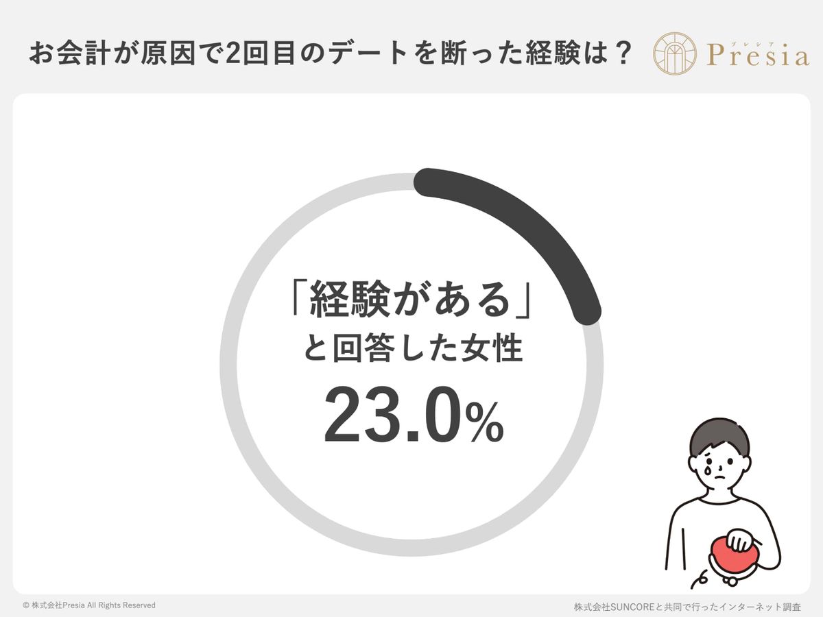 「初デートの会計方法が原因で、2回目のデートを断った経験はあるか?」という問いには、23%が「ある」と回答。そのうち「割り勘にされたこと」よりも、「会計時の相手の態度や言動が気になった」という理由が倍以上にのぼった。