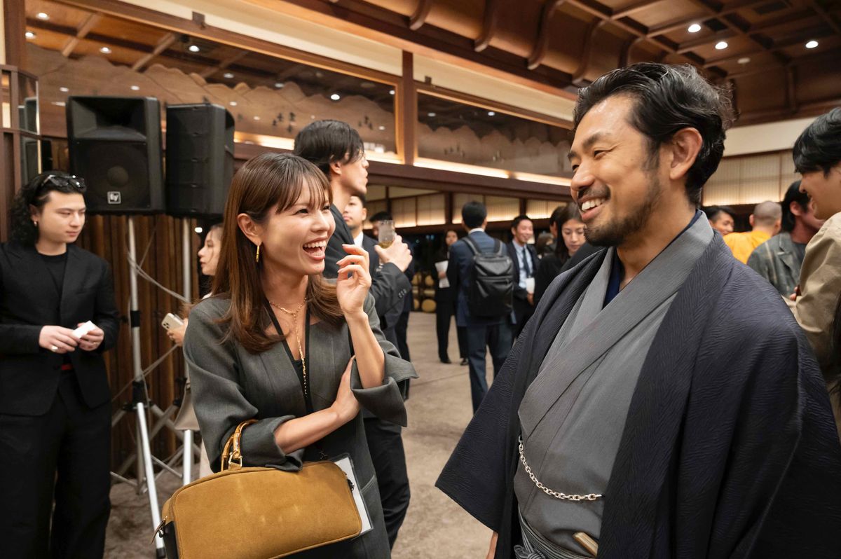 室町時代より奈良に受け継がれる伝統技法で製造された希少な日本酒で、参加者らは仕込みに使用される吉野杉の木桶の香りと深い味わいを堪能しながら、会話を楽しんでいた。