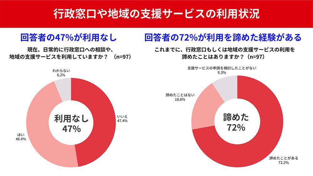 調査では、回答者のうち、公的な支援サービスを利用していない人が47パーセントにのぼることがわかった。さらに、サービスを利用しようと思ったが諦めた経験のある人が72パーセントもいた。