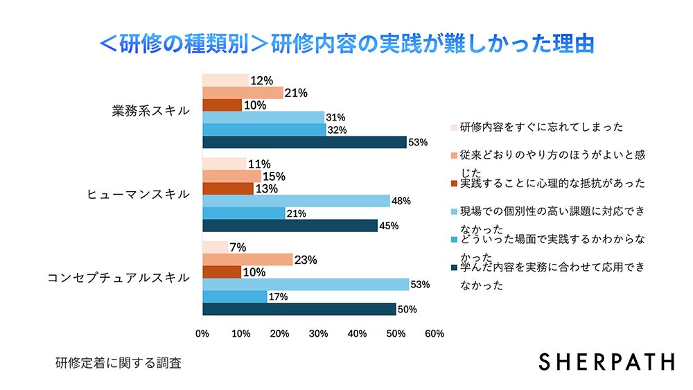 ヒューマンスキルとコンセプチュアルスキルにおいては、どんな場面でそのスキルを使えばいいかわからないという意見も非常に多かった。