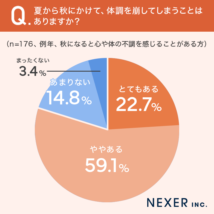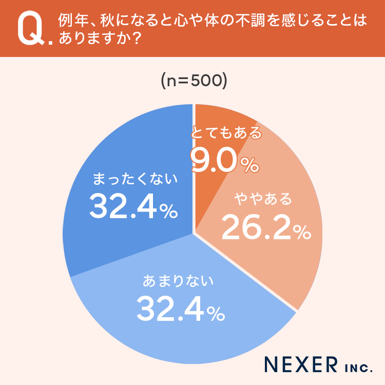 調査によると、例年秋になると心や体の不調を感じる人は35.2%に上った。「とてもある」が9%、「ややある」が26.2%で、3人に1人以上が季節の変わり目に何らかの不調を経験している。