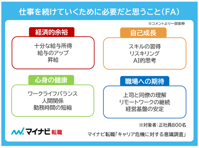 安定して仕事を続けていくために必要なものは、「昇給」などの経済的余裕、「スキルの習得」「AI的思考」などの自己成長、「ワークライフバランス」「人間関係」などの心身の健康だった。「リモートワークの継続」や「経営基盤の安定」など職場環境への期待もあった。