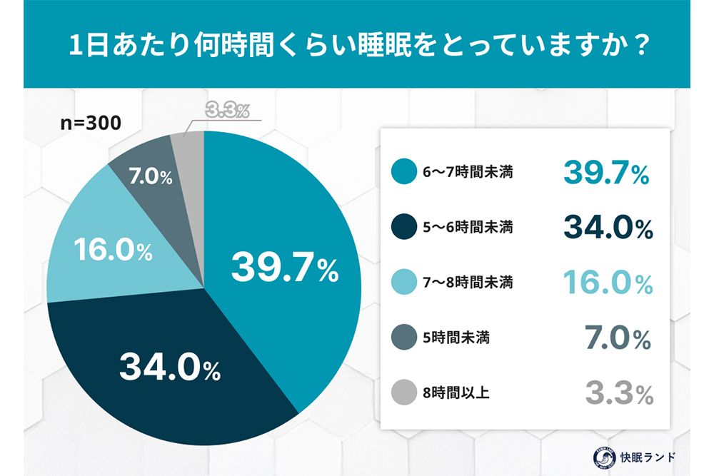 調査によると、1日あたりの睡眠時間は6〜7時間が最多でほぼ4割、次いで5〜6時間が3割強となった。7割を超える人が7時間未満の睡眠しかとっていない。