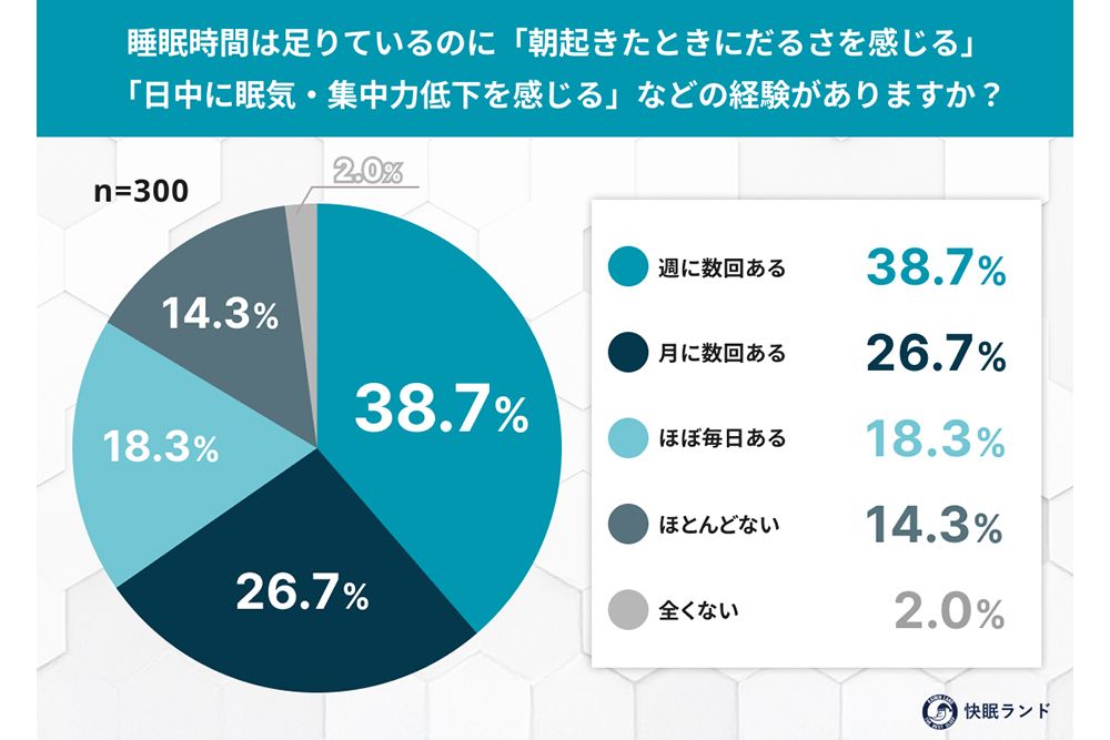 ところが、睡眠時間は足りているのに、朝起きたときにだるさを感じる、日中に眠気を感じる、集中力が落ちるという経験をした人は、週に数回がほぼ4割、月に数回がほぼ3割、ほぼ毎日が2割弱で、経験者は8割を超える。
