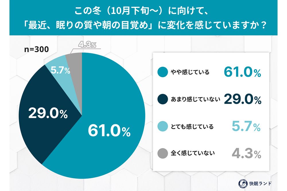 10月から冬にかけて、日照時間の短縮や気温の変化により体内リズムが乱れ、眠りが浅くなる。そのため、睡眠時間は足りていても眠い、朝起きたときに体がだるいといった「隠れ睡眠負債」が現れやすくなるという。そこで、快眠グッズの製造販売を行うムーンムーンが運営する睡眠情報サイト「快眠ランド」は、全国の20〜70代の男女300人を対象に、冬に向けた睡眠の変化と睡眠負債に関する実態調査を実施した。