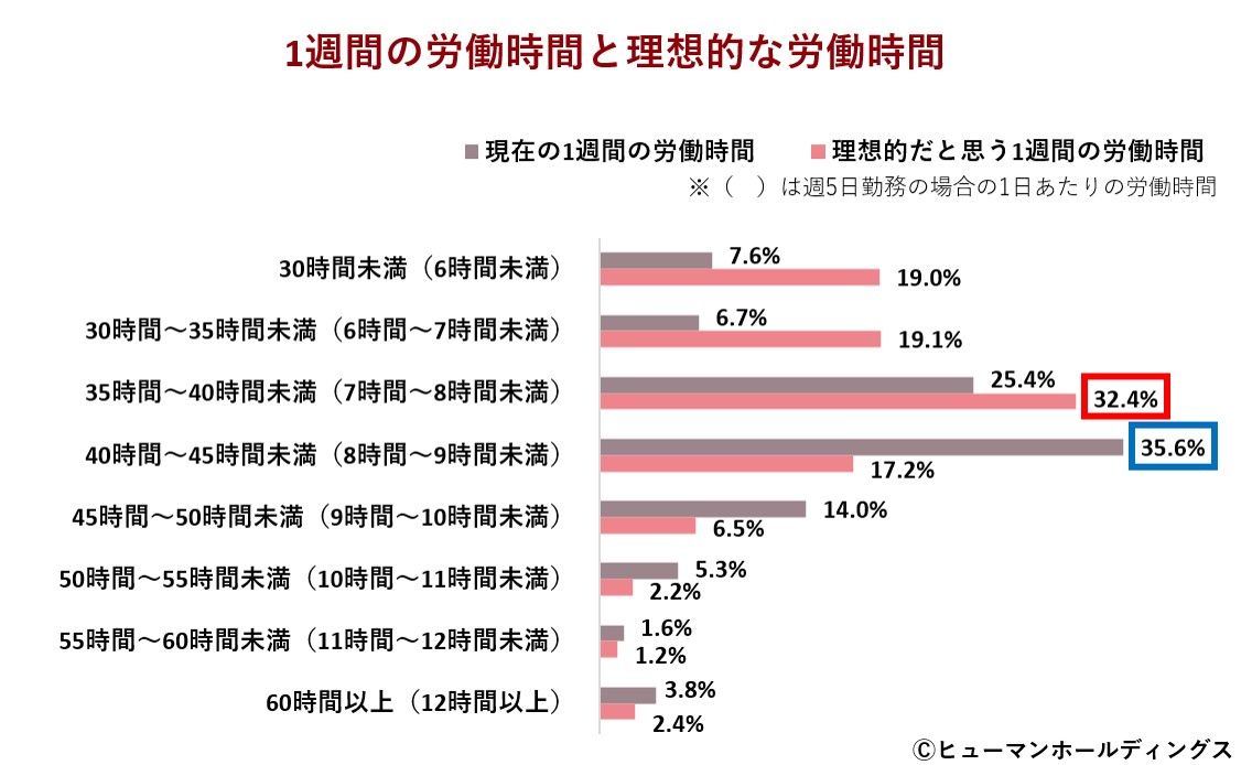 これは、職場に導入してほしい働き方制度に対しても、「週休3日」が35.1%とダントツで、理想的な労働時間も、現実(40時間~45時間未満)よりも短い35時間~40時間未満を望む声が多かった。
