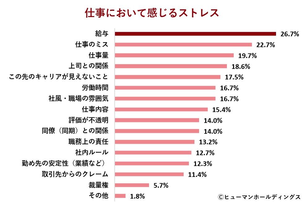 ただ、仕事においてストレスを感じることとしては、「給与」と回答した人が26.7%と、現在の労働時間は給与に見合わないと考える人が4人に1人いるという結果だった。