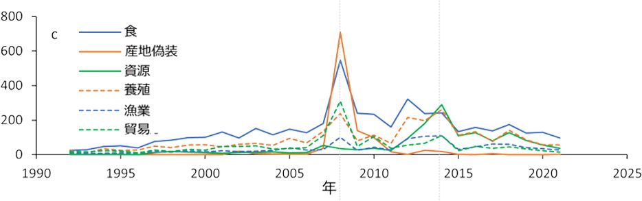 全体を通じて圧倒的に多いのは「食」だ。また食につながる貿易に関する記事も多いことから、日本の新聞は、食や貿易といった「生活や経済に直結するテーマを中心に報じる傾向が強く、国際的な保全評価そのものが、長期的な報道や世論形成に結びつく力は限定的」と研究グループは分析した。