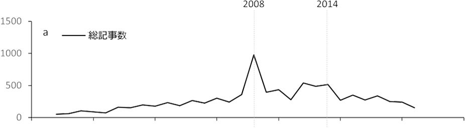 ウナギに関する記事は全部で8387本あった。年間で最大数となったカテゴリーは、2008年の「産地偽装」で、ウナギ関連の記事数が977本に達した。ところが同年、IUCNが、当時日本が大量消費していたヨーロッパウナギを絶滅危惧種に区分したことを報じる記事は見あたらなかった。