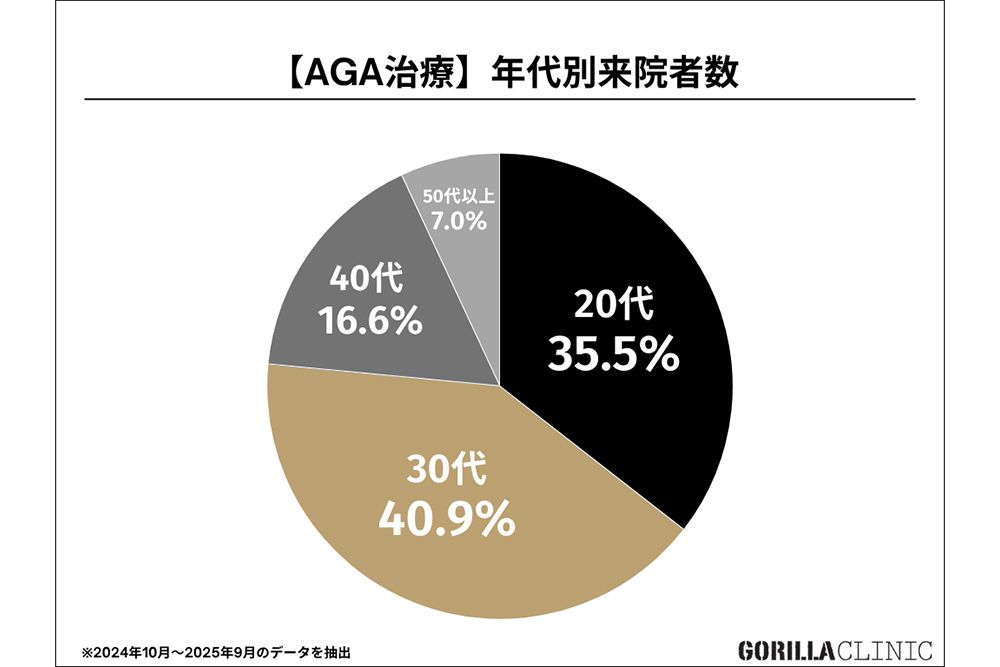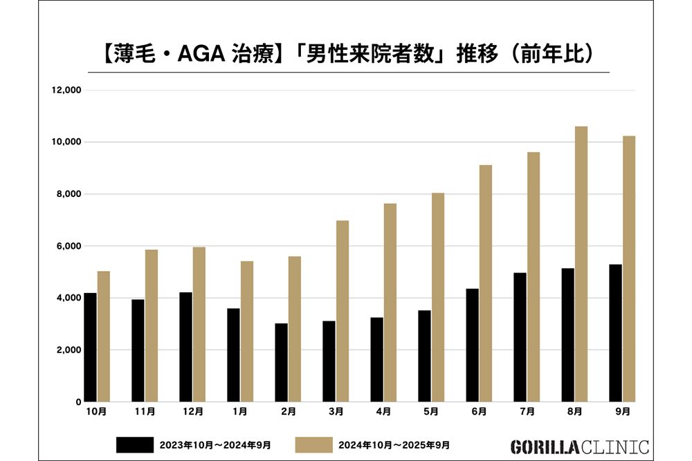 男性専用の総合美容医療ゴリラクリニックは、昨年10月から今年9月までの来院者数の推移を発表した。2月ごろから来院者は急激に増加し、8月には昨年10月の約2倍となる1万人超を達成した。2023年10月から1年間の推移は安定していたが、今年は大きく伸びている。同院は、脱毛や皮膚の美容医療にも対応しているが、とくに増えているのは薄毛とAGA治療の分野だ。