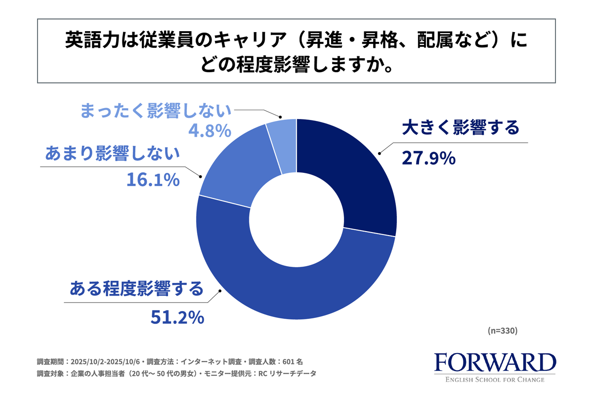 また、英語力が従業員のキャリア(昇進・昇格、配属など)にどの程度影響するかを聞いたところ、「大きく影響する」(27.9%)、「ある程度影響する」(52.1%)と約8割が「影響する」と回答。英語力が採用時だけでなく、入社後のキャリア形成にも関わってくる実態が明らかになった。