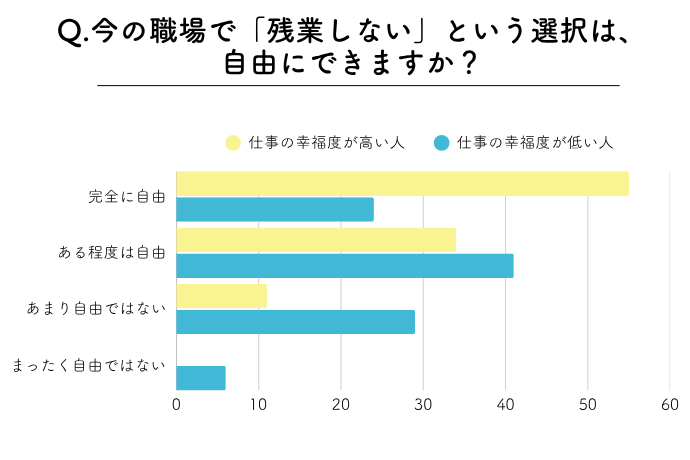 幸福を感じている人の55%が「残業するかどうかは完全に自由」と回答した一方、「まったく自由ではない」人で幸福を感じている人は0%だった。残業時間が短くても「上司が残業していると帰りづらい」(35歳・営業事務)という理由で幸福度が低い人もいた。