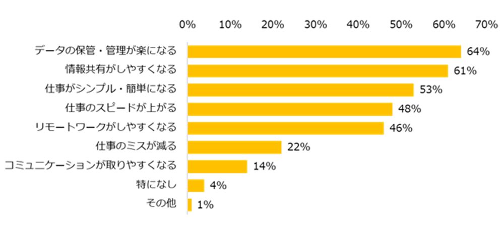 それによる恩恵は、データ管理が楽になる、情報共有がしやすい、仕事がシンプルになる、スピードが上がる、リモートワークがしやすいなどがあげられた。