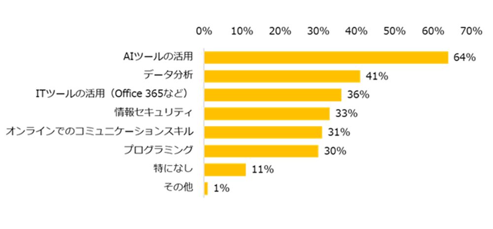 職場のデジタル化が進んで省人化されれば、派遣社員が切られる。派遣は、仕事が楽になればお払い箱という、悲しい運命を背負っているわけだ。だが、不安に負けてはいない。デジタル化に対応して身につけたいスキルを聞くと、AIツールの活用が64パーセントと突出して多く、データ分析、ITツールの活用、情報セキュリティーなどの専門的なスキルが続いた。それらを習得すれば、デジタル化を進めたい多くの企業に求められる人材となるはずだ。