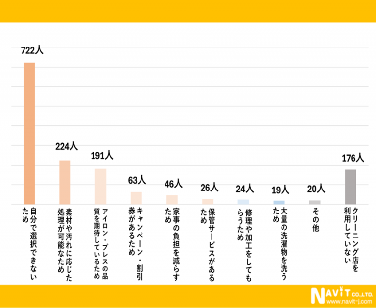 自由回答では、クリーニングは「価格が高い」「受け取りに時間がかかる」「他人の衣類と一緒に洗われるのが気になる」など、コストと利便性に関する不満が多かった。ほかにも「ポイントの有効期限が短い」「服の紛失が不安」といった声もあり、信頼面での課題も見られた。