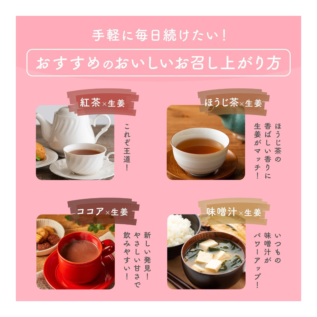 原材料には、高知県産の生姜「黄金の里」のみを使用。8時間かけてじっくりと蒸すことで、刺激的な辛さの辛み成分「ジンゲロール」が「ショウガオール」に変化して、じんわりとした辛みを味わえる。微粉末タイプのため、1日の摂取目安量(小さじ約1/3)を紅茶やココア、みそ汁などに混ぜるだけで、手軽に毎日摂取できるのが嬉しい。
