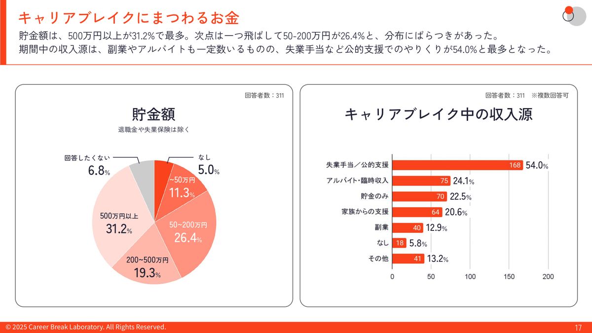 キャリアブレイクを始める際の貯蓄額は「500万円以上」が31.2%で最多だったが、「50万~200万円」が26.4%と、分布にばらつきがあった。期間中の収入源は、失業手当など公的支援が54.0%と最も多く、次いでアルバイト・臨時収入が24.1%、貯金のみが22.5%となった。副業や家族からの支援で乗り切った人も一定数いた。