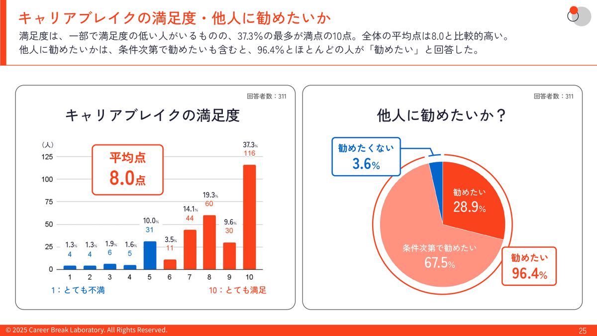 それでも満足度が10点満点で平均8.0点と高い理由は何か。満足度の高かった経験者からは「15年くらいは自分の土台になるような経験資本ができた」(30代男性)、「立ち止まる時間で自分の軸を取り戻せた」(40代女性)といった声が寄せられた。