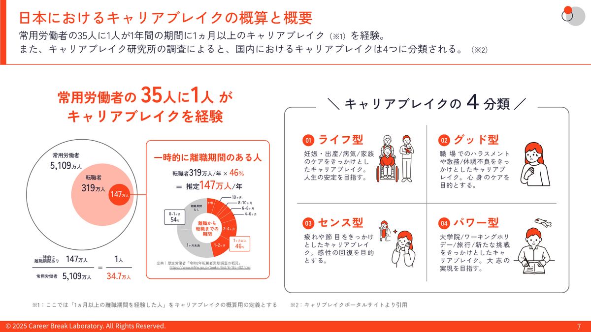 キャリアブレイクとは、休暇、休職、離職などを通して今までの中心的な役割を手放し、人生と社会を見つめ直す期間のことを指す。厚生労働省のデータから推測すると、常用労働者35人に1人が1カ月以上のキャリアブレイクを経験している計算になる。