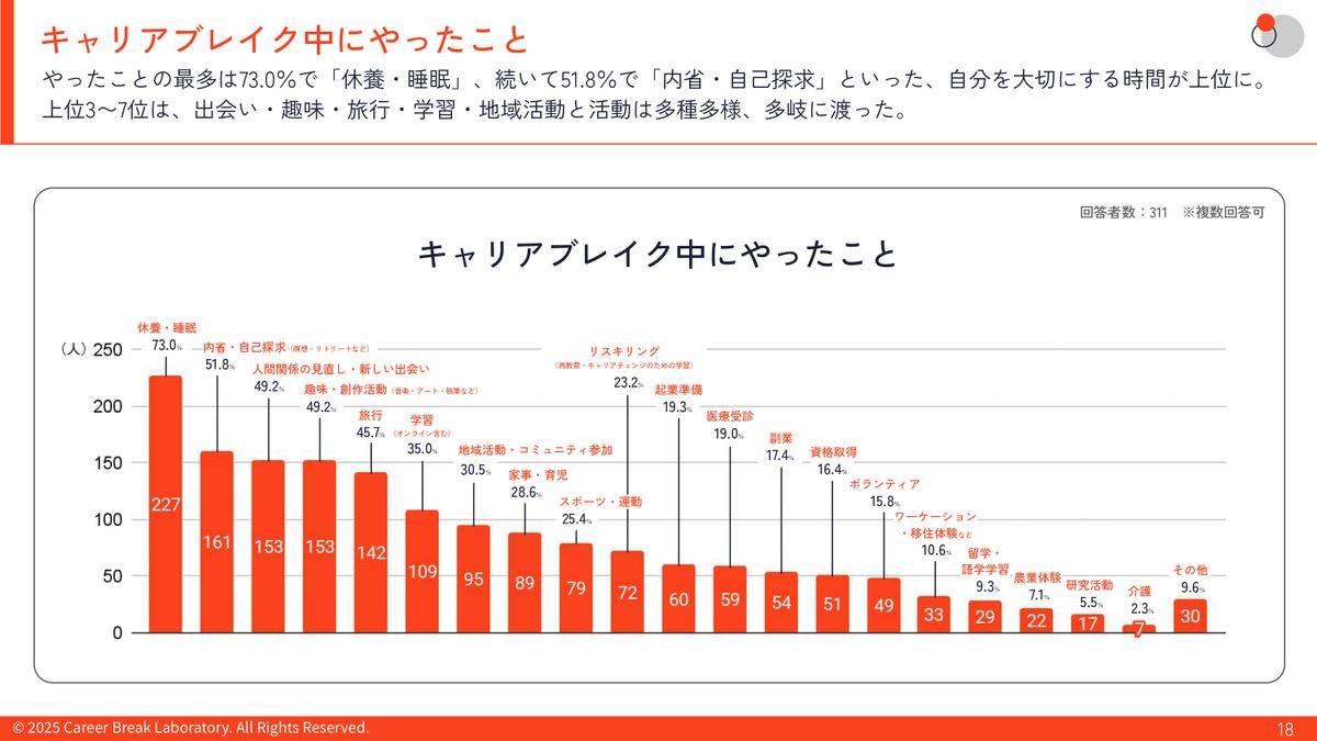 期間中の過ごし方は、複数回答で7割以上が「休養・睡眠」を挙げたが、それだけではない。約半数が「人間関係の見直し」「内省・自己探求」「趣味・創作活動」「旅行」などにも取り組んでいた。