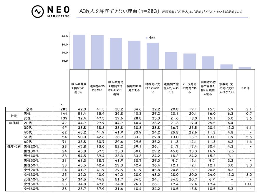 気になるのは反対の理由だ。意外なことに、AI故人に違和感がない若い年代に「故人の意思を確認できないため不適切」との意見が多かった。そう考える60代はもっとも少ない。AIの本質をよく理解している世代ならではの疑問だろう。