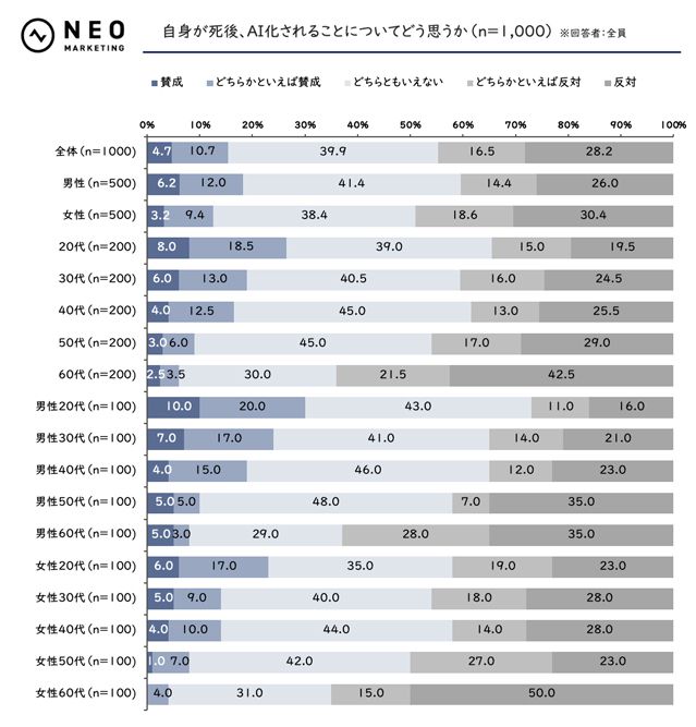 倫理的な問題は、生前の本人の同意があればある程度は解消されるだろう。そこで、自分自身がAI化されることをどう思うかを問うと、AI故人サービスには賛成する人が全体では約30パーセントだったのに対して、自分がAI化されることを望む人は約15.4パーセントと少なかった。もっとも積極的だった20代男性も、自分の場合になると割合がわずかに減る。60代は60パーセント以上が反対に回った。