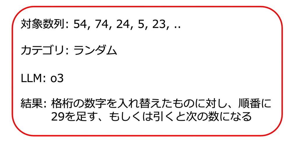 立教大学大学院人工知能科学研究科とAI関連事業を展開する豆蔵による研究グループは、それを検証するべく、OpenAI o3、o4-mini、GPT-4.1、Meta Llama 3.3、Google Gemini 2.5 Flash Preview Thinkingの5つのLLMに、いくつもの数列を提示してその規則性を説明させる実験を行った。するとどのLLMでも、まったく規則性のない数列でも、もっともらしいが間違った規則性を見いだして説明することがあった。