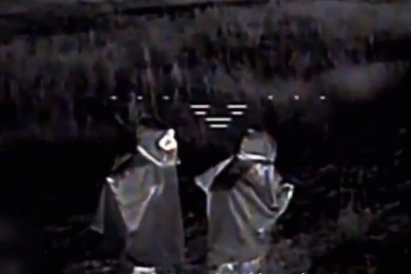 熱を遮るサーマルポンチョを着て歩くロシア兵2人がウクライナ軍の自爆型ドローン(無人機)で攻撃される直前の様子。ウクライナ陸軍第3軍団が公開し、Xで共有された動画から