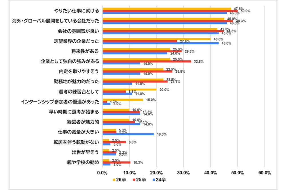 外国人留学生の人材紹介などを展開するASIA Linkは、2025年度卒業予定の留学生を対象に、従業員300人以下の中小企業への就職に関する調査を実施した。そのうち40人(約87パーセント)が中小企業に応募していた。日本人学生の応募は54.2パーセントなので、ずいぶん割合が高い。応募した留学生40人に理由を尋ねると、「やりたい仕事に就ける」、「海外・グローバル展開している」、「会社の雰囲気がよい」がトップ3で、これは2023年度、2024年度の調査を通じて変わっていない。