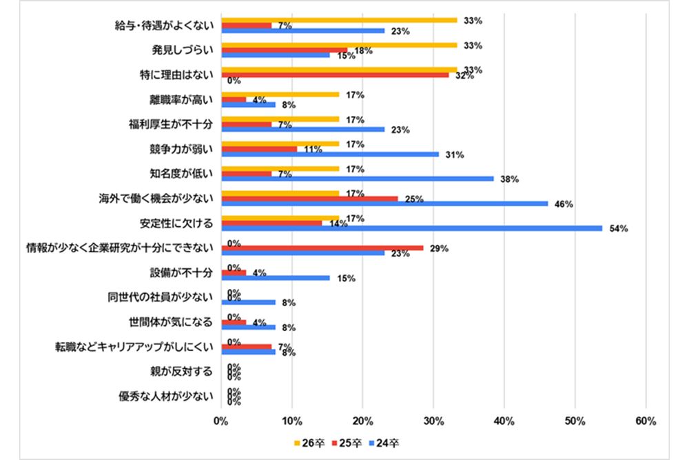 応募しなかった人に理由を尋ねると、前年まではランクが低かった「給与・待遇がよくない」が1位になった。これは昨今の不景気と物価高が影響しているのかもしれない。注目すべきはもうひとつのトップ3「発見しづらい」だ。一般にはあまり知られていない中小企業には、見つけにくいという弱点がある。つまり、中小企業に就職したかったのに諦めた人が少なからずいることが示唆されている。