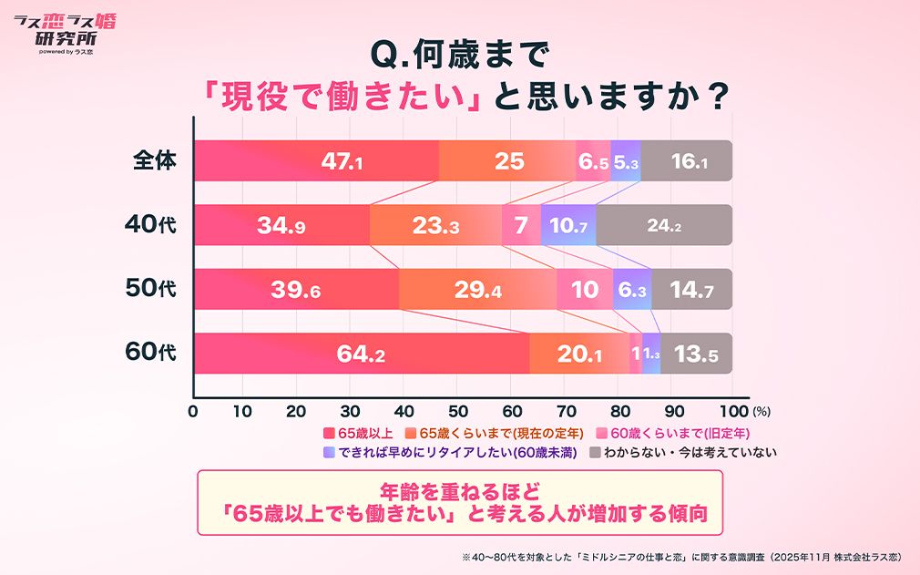 何歳まで現役で働きたいかを尋ねると、全体では47.1パーセントが65歳以上と答えた。60代の人たちは64.2パーセントだ。年齢を重ねるほどその割合が増えている。働きたい理由は、「生活を豊かに保ちたい」が57.8パーセントともっとも多く、「人との関わりを持ちたい」、「健康維持のため」という答えがそれに続いた。経済的事情もあろうが、働くことは「ウェルビーイング」につながっているとラス恋は指摘している。