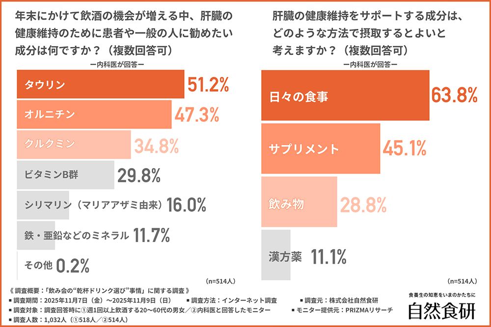 肝臓を守るためには、毎日の食生活も重要だ。内科医が宴会シーズンに一般の人たちに摂取を勧めたい成分を聞くと、1位がタウリン、2位がオルニチン、3位がクルクミンとなった。これらはサプリで取ってもいいが、日々の食事で取るのがいちばんだと医師は答えている。