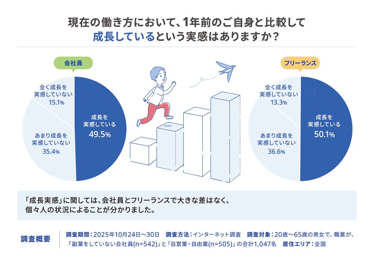 1年前と比べて成長を実感しているかという質問では、会社員が49.5%、フリーランスが50.1%とほぼ同水準だった。