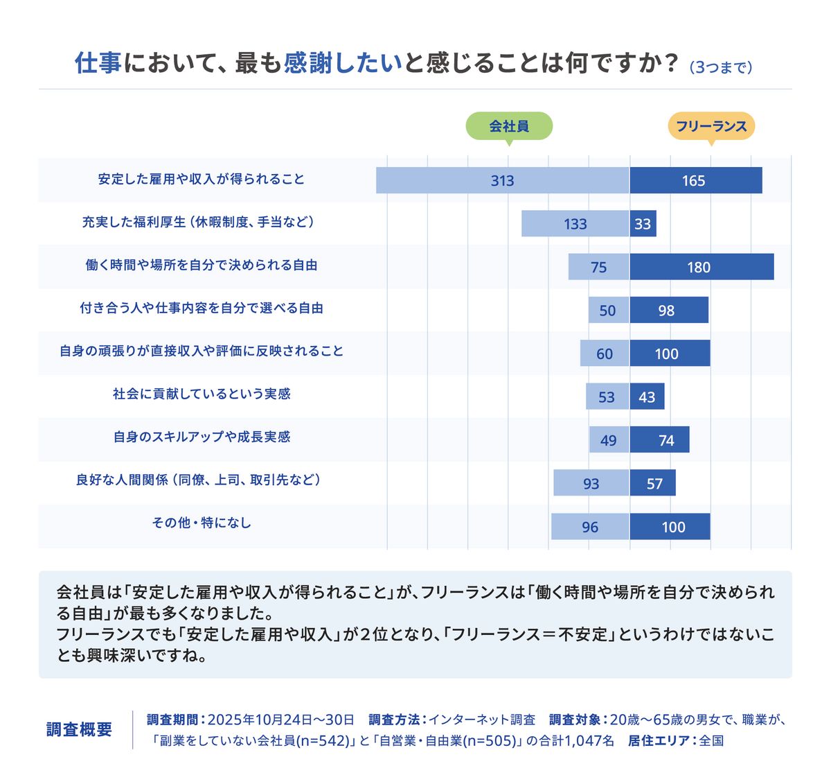 仕事に対して最も感謝していることは何か。この問いへの回答も、雇用形態によって明確に分かれた。