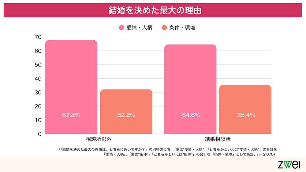 「条件だけで結婚した」というのが事実ではないことは、結婚を決めた理由からもわかる。結婚相談所で出会った夫婦もそれ以外の夫婦も、条件や環境よりも愛情や人柄が最大の決め手だと答えた人がずっと多く、愛情と条件の比率は、双方ともにほとんど差がない。
