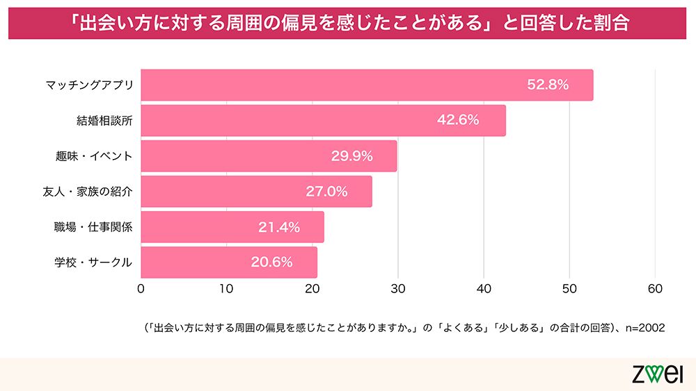 結婚相談所ツヴァイのツヴァイ婚活研究所長、落合大氏は、「条件だけで結婚して本当に幸せになれるのか?」という負のイメージが、いまだに結婚相談所につきまとっていると話す。そこで同社が全国の20〜50代の既婚男女2070人を対象にアンケート調査を実施したところ、出会い方に周囲の偏見を感じたことのある人たちのなかで、結婚相談所の利用者は、マッチングアプリのユーザーに次ぐ多さであることがわかった。