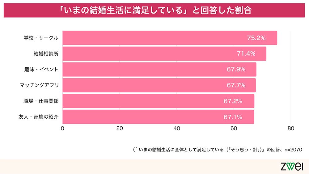 しかし、現在の結婚生活に満足していると答えた人の出会いの場を聞くと、第2位に結婚相談所が入った。つまり、趣味、マッチングアプリ、職場、友人の紹介で出会って結婚した人たちよりも、わずかながら幸せだと言える。