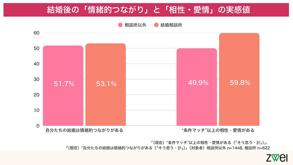 しかも、結婚後の「情緒的つながり」と、条件がマッチしたこと以上の「相性・愛情」をどれほど実感しているかを尋ねたところ、結婚相談所利用者は、情緒的つながりがそれ以外の人たちよりわずかながら多く、さらに条件マッチ以上の「相性・愛情」は、ほぼ10ポイント多かった。