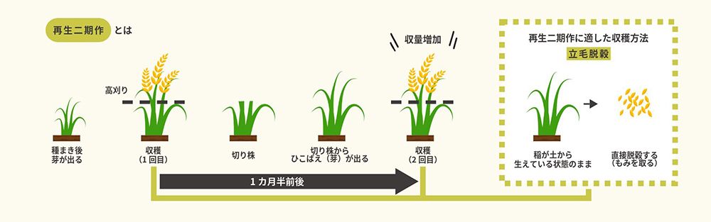 再生二期作とは、春に田植えをして成長した稲の穂の部分だけを刈り取り、1カ月半ほどして同じ株から育ち穂を付けた稲をもう一度刈り取るという農法。温暖化によって稲が栽培できる期間が延びたこともあり、多くの農家が実験的に導入を始めている。