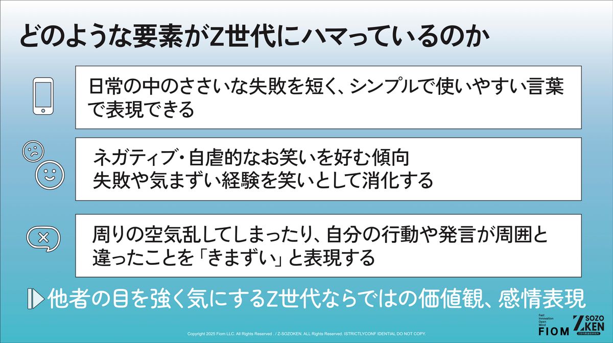 一方で、Z世代はこのネガティブな感情を、ただ避けるだけでなく、「不安」「緊張」「恥ずかしい」といった複雑な感情を、「気まずい」という一言で表現する共感性の高い便利ワードとして活用している。