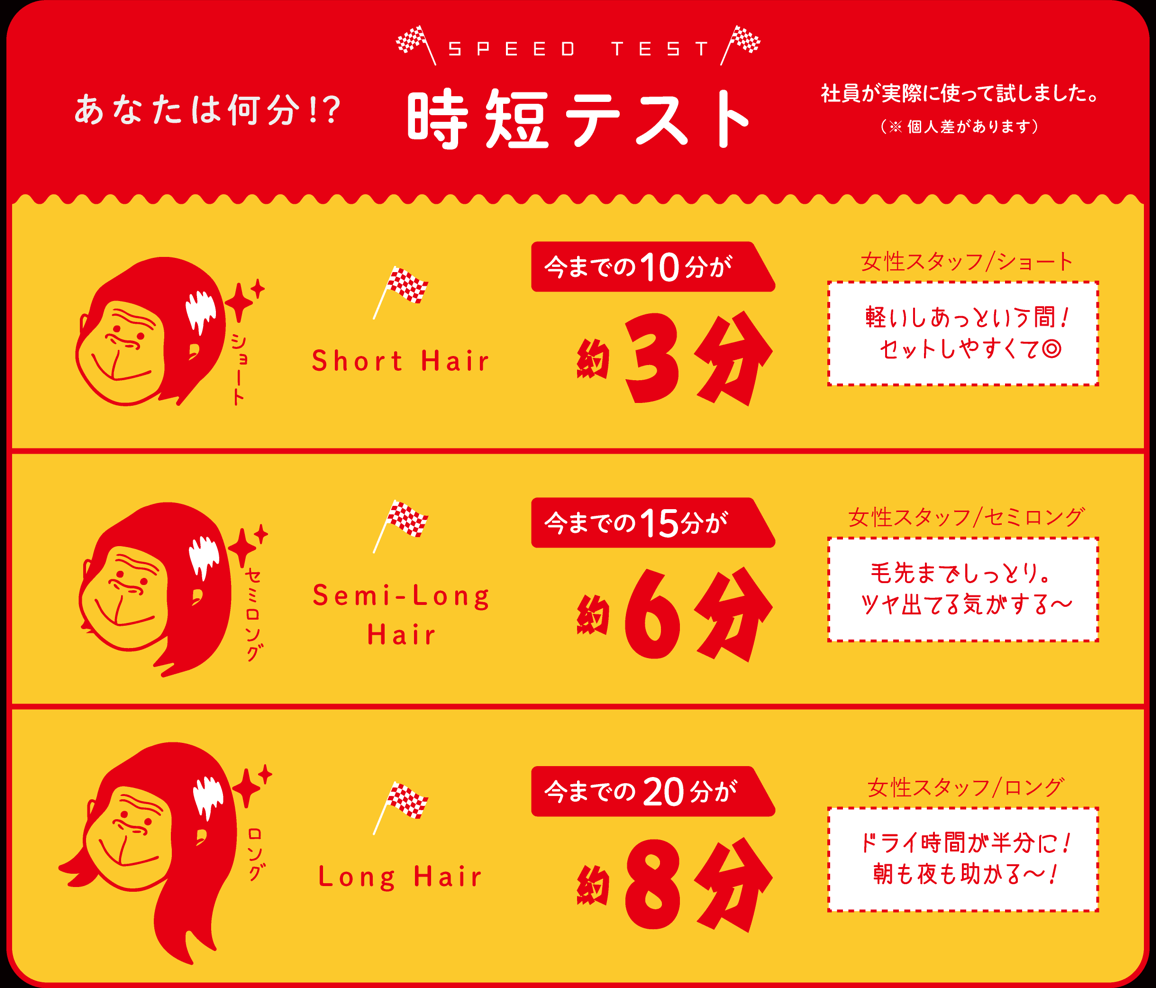そんなゴリラシリーズ初となる美容家電が、最大風速約63.91m/秒というハイパワーが特長のドライヤー「ゴリラのひとふき」。直径32mmの大きな羽を備えた高速モーターが爆風を生み出し、とにかく早く休みたい夜の風呂上がりや忙しい朝の支度時間などに髪を乾かす時間を短縮してくれるのが嬉しい。