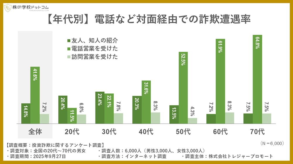 オンライン株式スクール「株の学校ドットコム」は、全国の20〜70代の男女6000人を対象に投資詐欺に関する調査を行った。それによると、年代別に投資詐欺の被害に遭った割合では20代がもっとも多く9.1パーセントにのぼった。11人に1人が被害を受けたという、大変な数だ。60代以降は遭遇件数が多い割に被害は少ない。